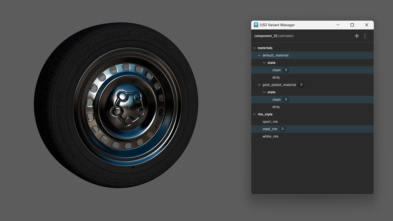 より強力なアセット構築ワークフローが導入され、シーン内のオブジェクトを使用して、完全に自己完結型のプロダクション対応の USD アセットを Maya の UI から直接管理できるようになりました。