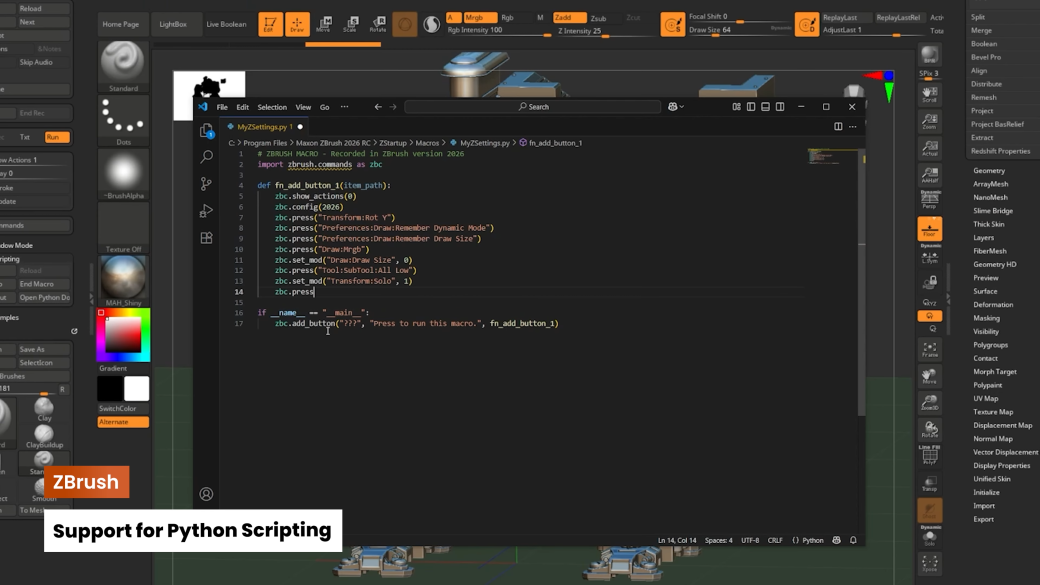 Python が ZBrush の標準スクリプト言語として導入され、他の3Dアプリケーションと同様に、プラグイン、自動化、ツールを自身で作成できるようになりました。