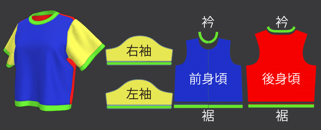 各パーツの名称、身頃、アームホール、ダーツ、縫い代など